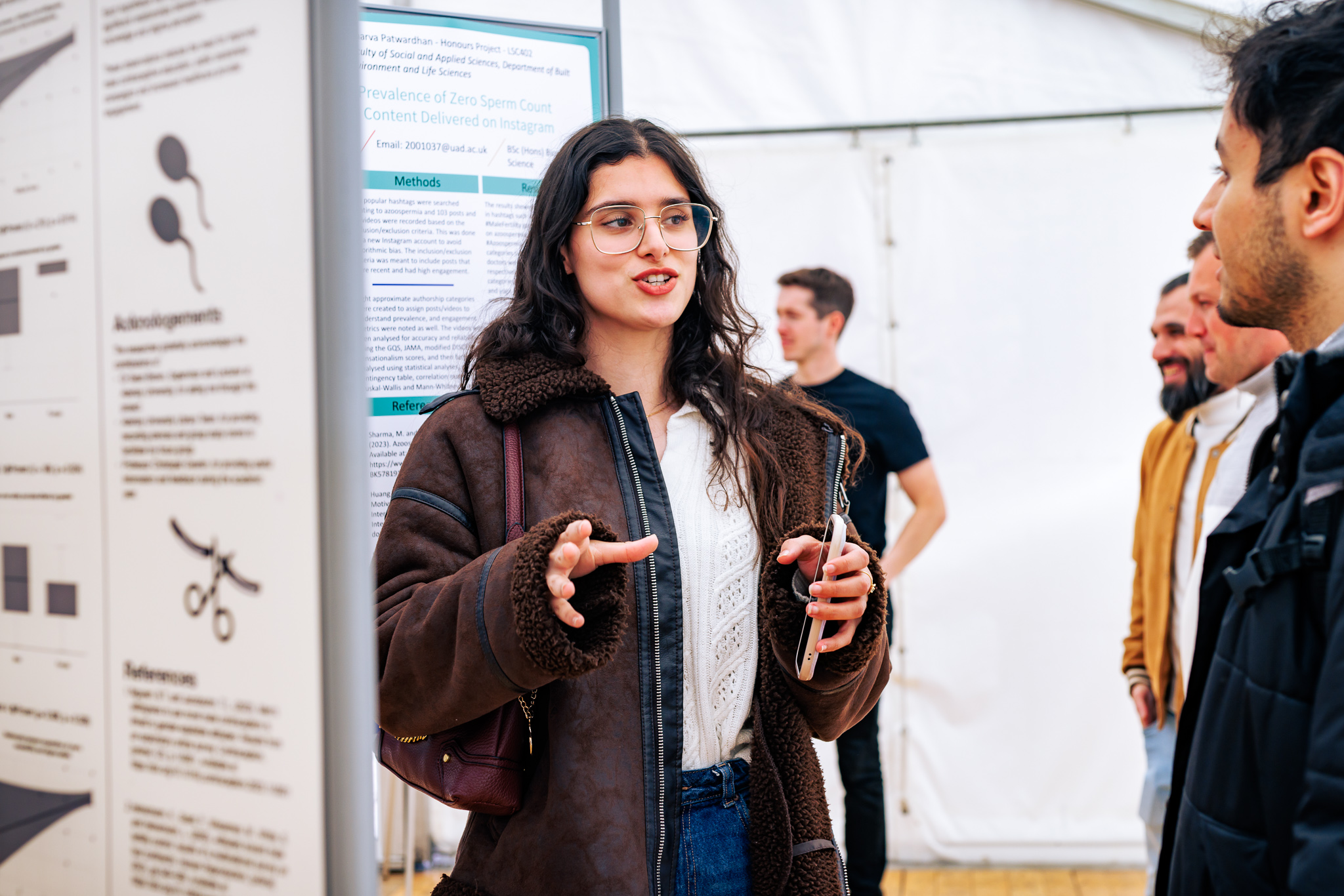 Held on Wednesday 7 May 2025, this year’s event saw final-year students from Abertay’s Biomedical, Forensic Sciences, and Food Sciences programmes present their Honours projects in an outdoor marquee, offering a bright and open space for discussion and discovery.