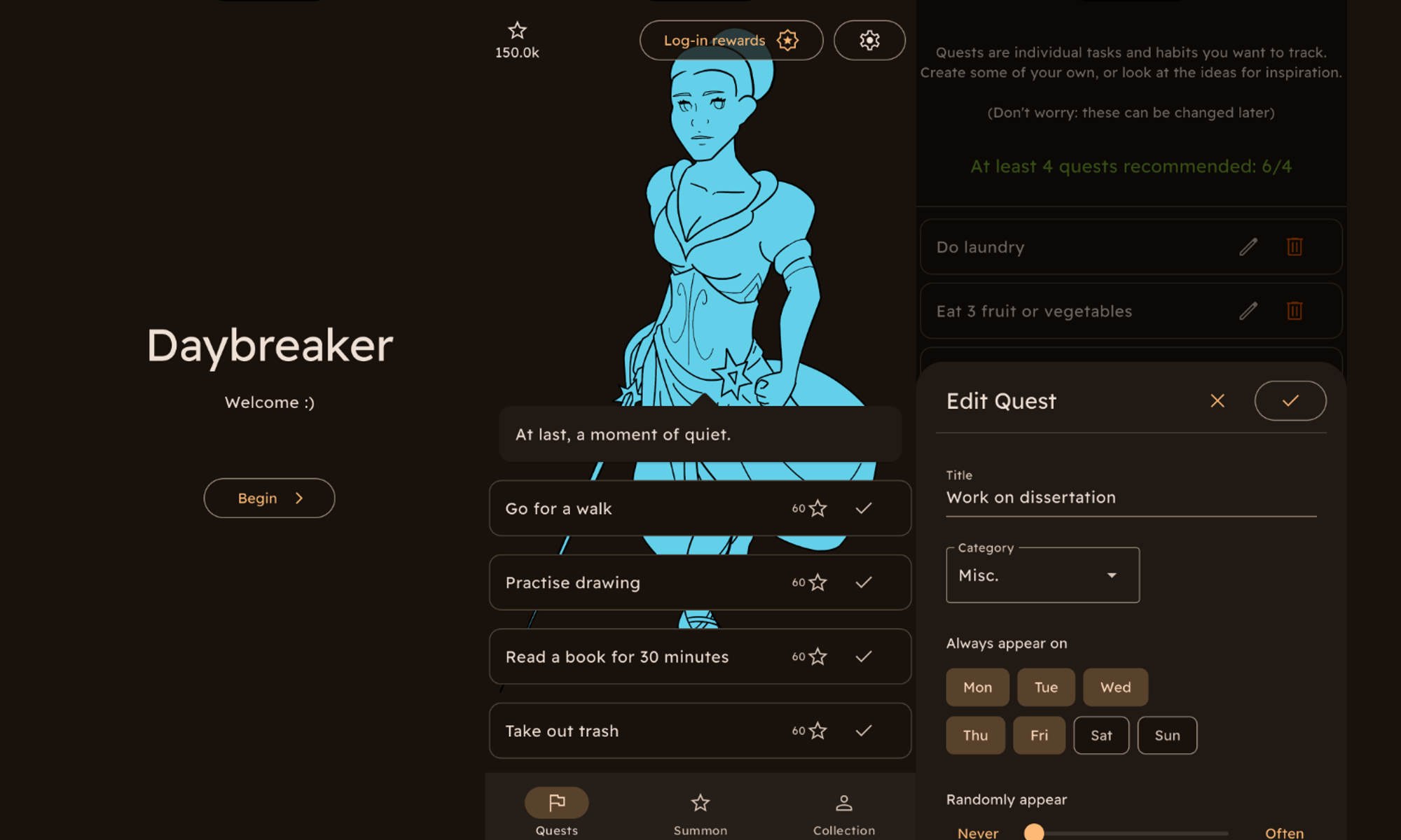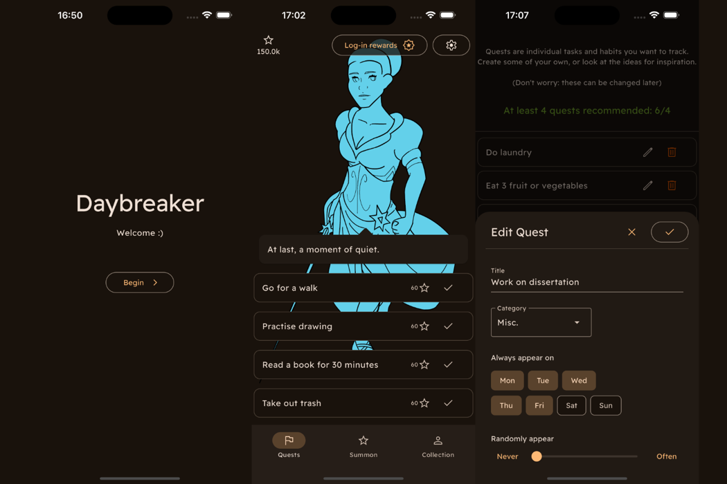 Free-to-play games rely on all kinds of tricks to take your money: gacha, lootboxes, battle passes, flash sales and more. These "dark patterns" are designed to get you addicted to playing the game and spending money. But what if they can be used in a more positive way? Daybreaker turns these techniques on their head to build positive habits that can improve your life. Complete your Quests each day - chores, exercise, nutrition or anything you can think of - to collect and spend time with your favourite characters.