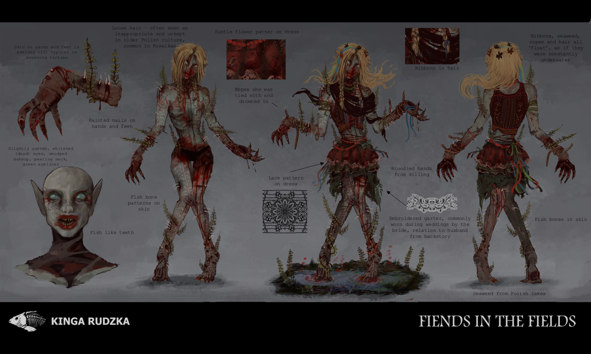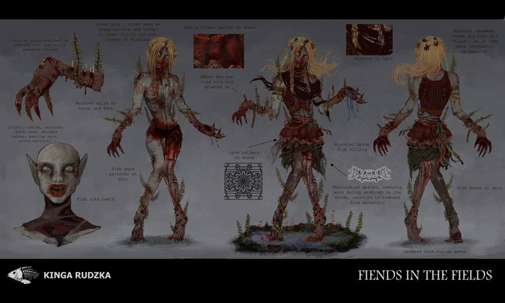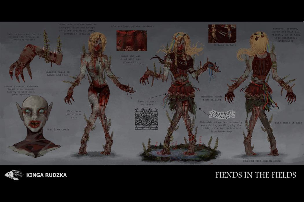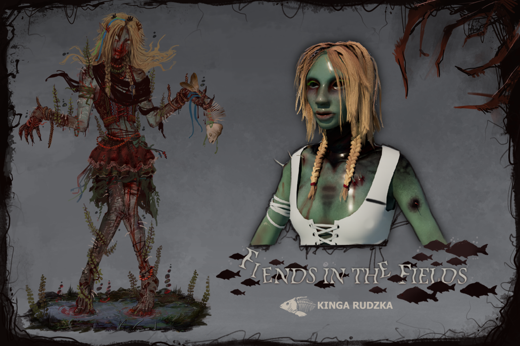 This project explores the contrast of beauty and horror within the portrayal of women in Polish mythology, combining it into one character and presenting it in the form of a 3D model ready for game implementation. Inspired by the tales of Rusalkas; strikingly beautiful or disgustingly grotesque water nymphs that lure men into their grasps with their beauty and playfulness, only to take their life. Incorporating traditional Polish attire and culture into the design, the project also explores how Dead By Daylight specifically handles its killer characters, looking at both visual design and technical optimisation.